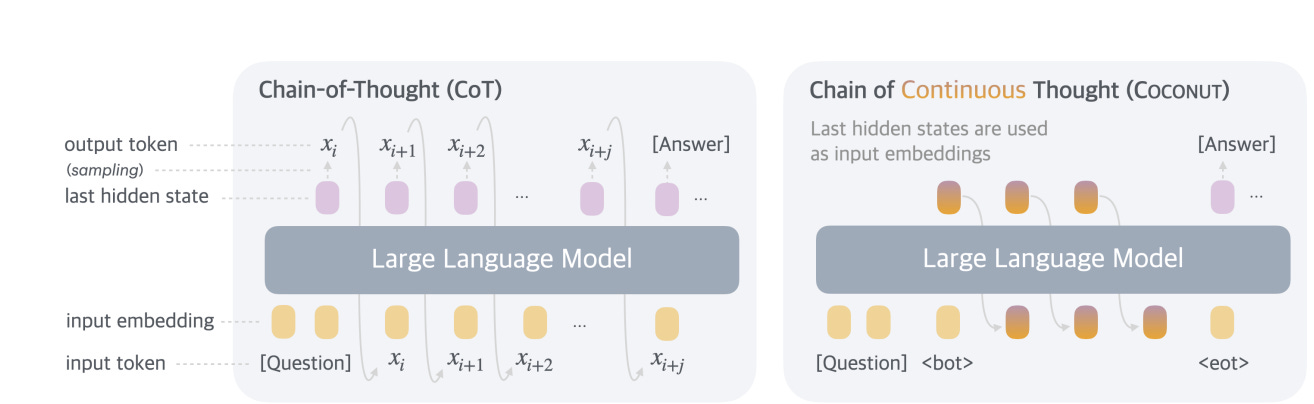 The Coconut paper by Meta proposes an alternative approach that challenges this token-by-token generation paradigm. Instead of immediately converting the model's internal state (logits) into discrete tokens, what if we kept this information within the model and allowed it to evolve?